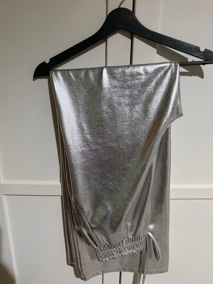 Gri metalik kumaştan, drapeli ve midi boyda, sokak modası ve günlük athleisure için uygun, vücuda oturan kadın pantolonu. ✨