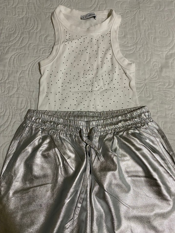 Kızlar için straplez yaka, payetli beyaz üst ve metalik gri, lastikli ve bağcıklı eşofman altı seti. ✨