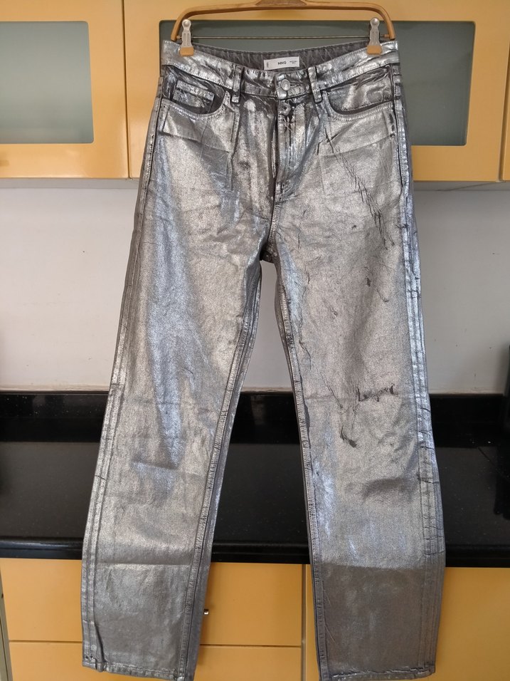 Gri renkte metalik görünümlü, regular fit. bazı yerlerde metalik kısımlarda çizgiler var, aslında modeli öyle defolu falan değil,son fotoğraflarda belirttim,