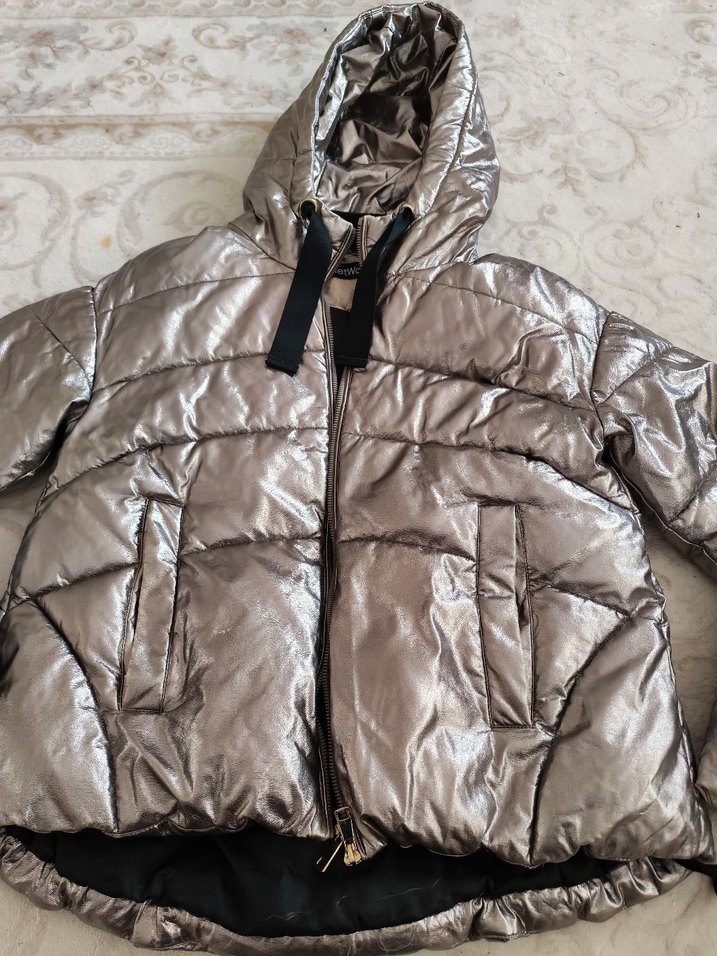 Gri metalik görünümlü, kürk detaylı kadın kışlık mont. Kapüşonlu, bol kesim ve günlük sokak stili için uygundur. Lve xl uyumlu kol ağızlarında hafif renk asinma var