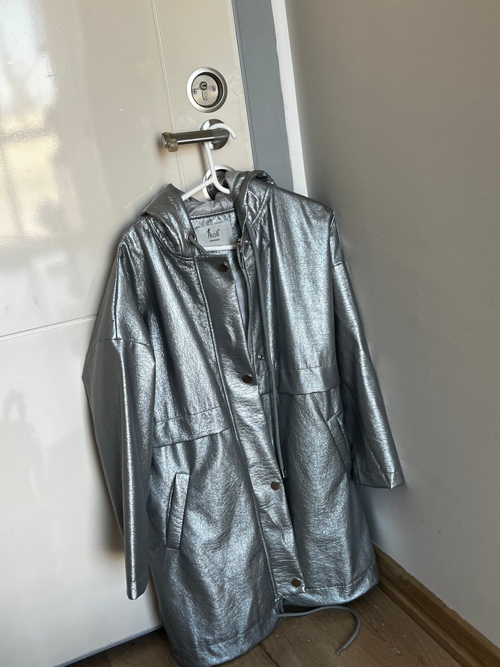 Gri metalik görünümlü, bol kesim kadın midi yağmurluk. Notlu yaka, uzun kollu ve kemerli detaylarla sokak stiline uygun.