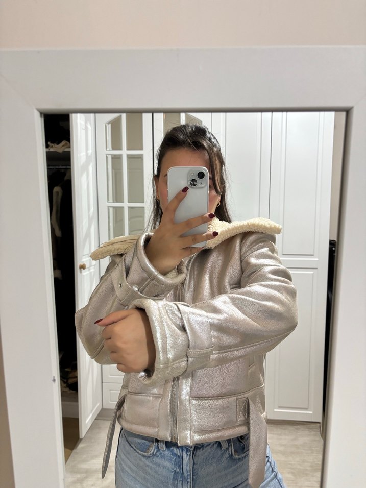 Gri metalik kumaştan yapılmış, kürklü detaylı, uzun kollu ve yakalı, normal midi boyda, sokak modasına uygun fitted kadın kışlık ceket. Günlük kullanım için uygun.