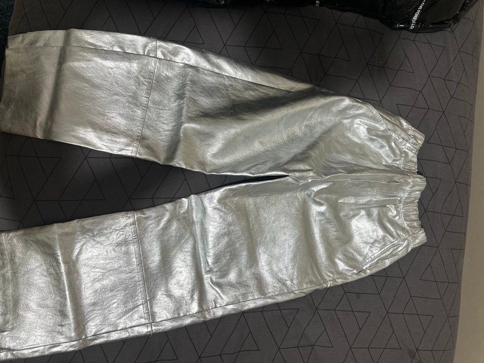 Gri metalik deri kumaştan, bol kesim ve midi boyda, sokak modasına uygun kadın pantolonu. Günlük kullanıma uygundur. ✨