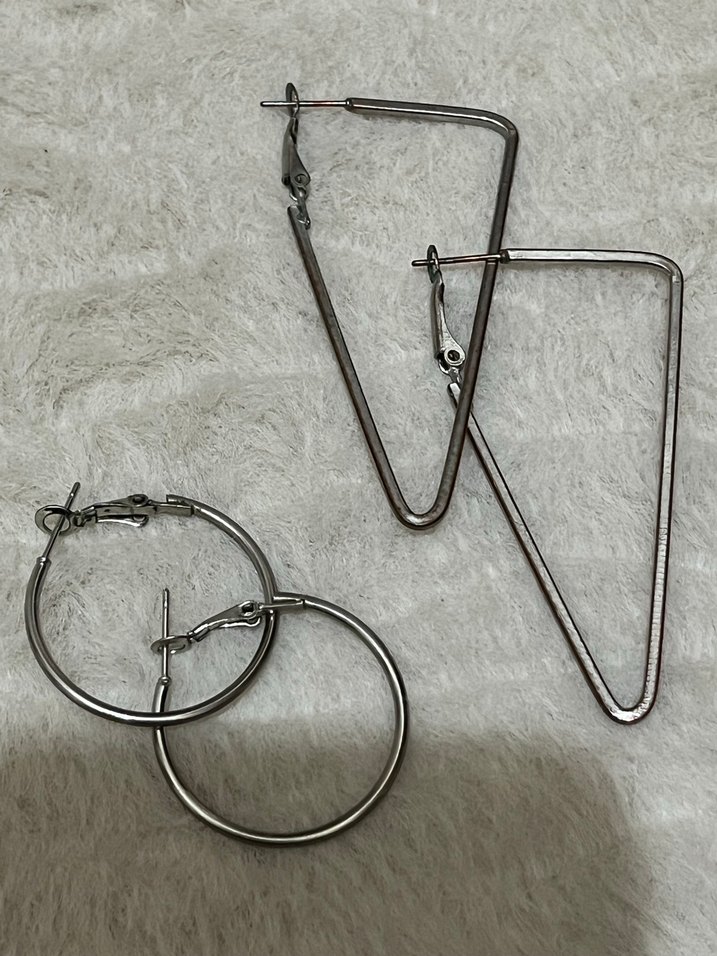 Gri metalik midi uzunlukta kadın küpeler, minimal ve bohem tarzda. Yuvarlak ve üçgen şekillerde, günlük kullanıma uygun. ✨