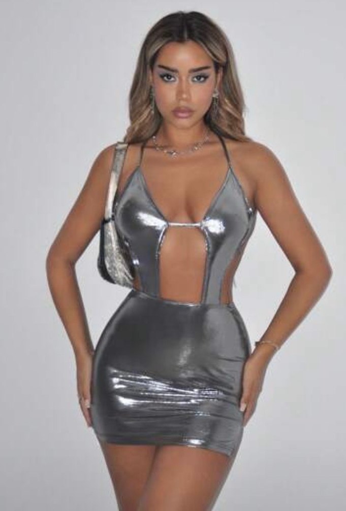 Sıkı kesim gri metalik mini elbise, derin V yakalı ve ince askılıdır. Parlak pullu yılan desenli detaylarla parti için uygundur. ✨