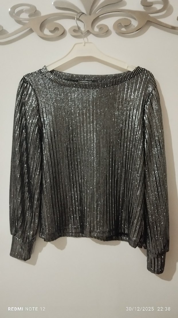 Gri metalik kumaştan, pilili ve çizgili desenli uzun kollu, yuvarlak yakalı, bol kesim bluz. Parti için şık ve çağdaş bir tasarım.
