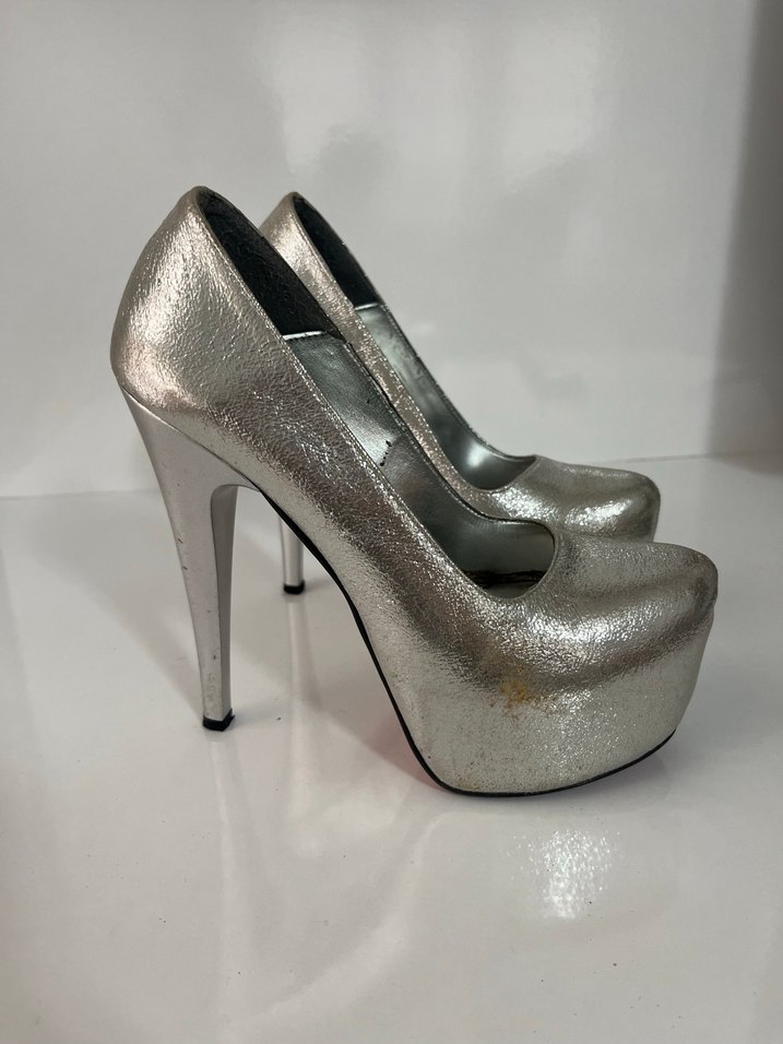 Gri metalik kaplama ve yüksek platform topuklu kadın abiye ayakkabılar, cesur ve çağdaş bir stil sunar. Romantik akşamlar için uygundur. ✨