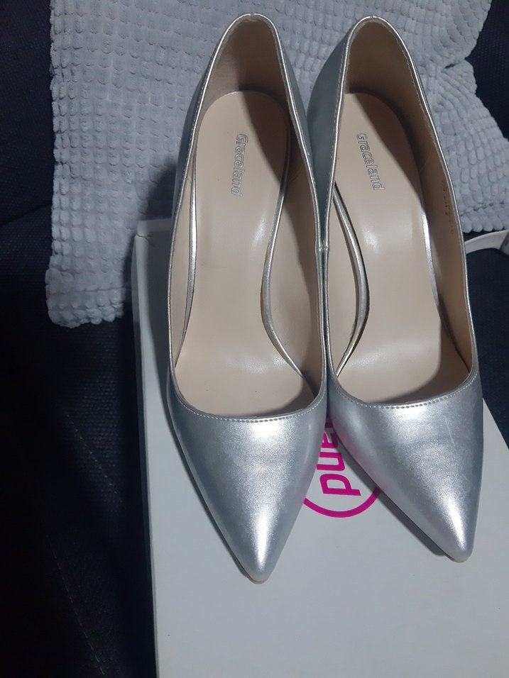 Gri metalik stiletto topuklu, minimalist tasarımlı kadın ayakkabı. Sivri burunlu ve desen içermeyen bu model, ofis için şık ve rahat bir seçenek sunar.