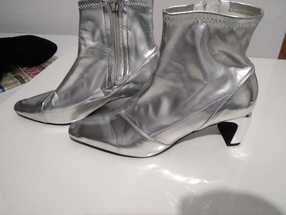 Gri metalik renkte, stiletto topuklu, fermuarlı, çağdaş avant-garde tarzında günlük kullanıma uygun kadın botu. ✨