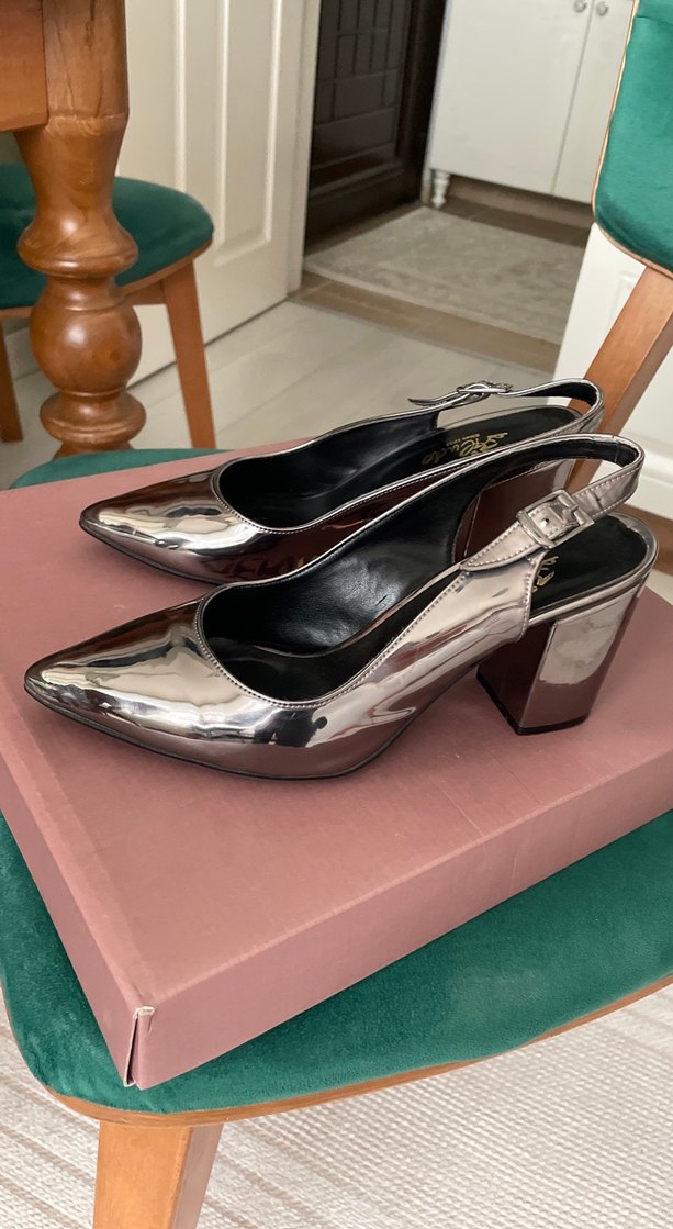Gri metalik malzemeden rugan , kadın topuklu ayakkabı. Tokalı ve kalın topuklu