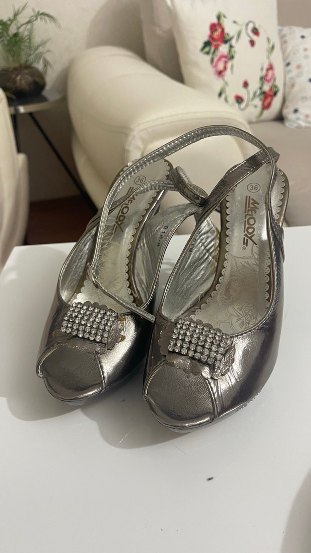 Göründüğü gibidir. Gri metalik malzemeden yapılmış, tokalı kayışlı ve yılan derisi desenli yüksek topuklu kadın ayakkabısı. Düğünler için modern klasik ve göz alıcı bir tasarım sunar.