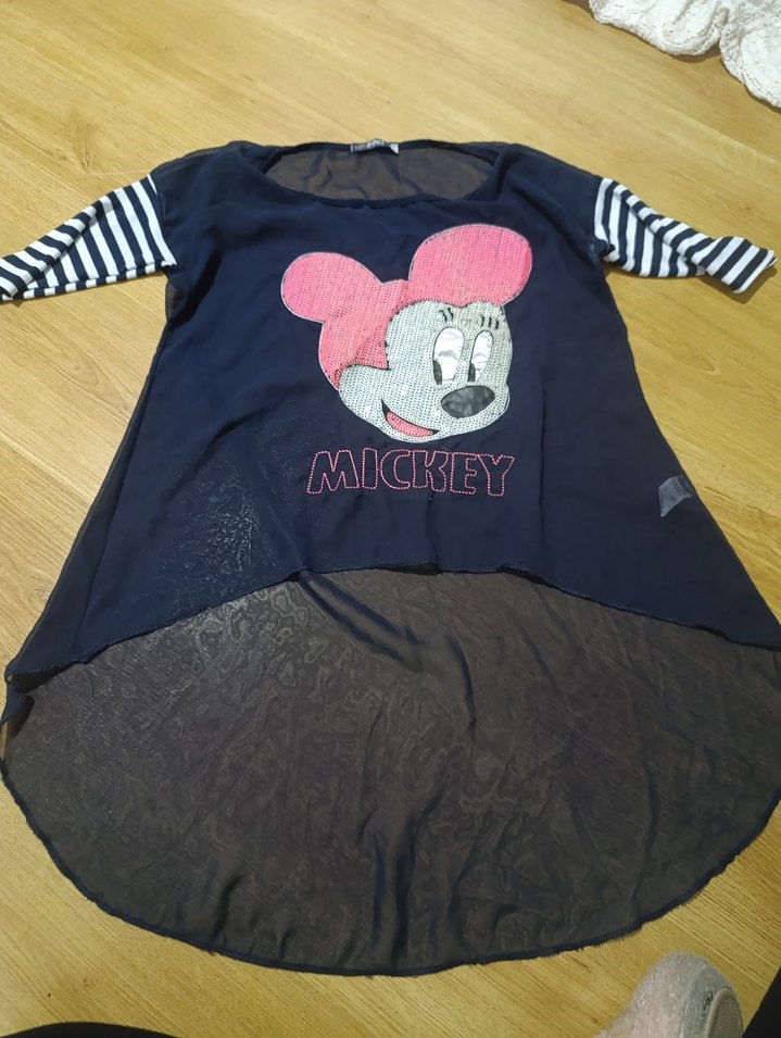 Gri renkte, kısa kollu ve yuvarlak yakalı, bol kesim kız tişörtü. Önde Mickey baskısı ve çizgili kolları ile dikkat çeker. Örgü detaylıdır.