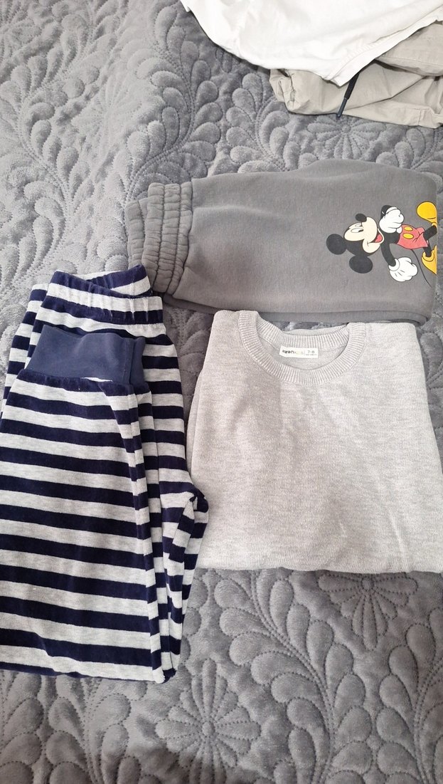 Bu erkek bebek takımı, yuvarlak yaka gri uzun kollu örgü üst, çizgili pantolon ve Mickey Mouse baskılı gri pantolondan oluşur. Yumuşak ve sıcak kumaştan üretilmiştir.