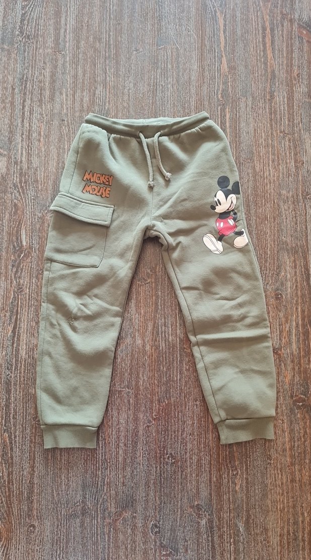 Gri renkte, yumuşak kumaştan üretilmiş, bol kesim erkek eşofman altı. Mickey Mouse baskısı ve düğmeli cep detayları bulunur. Belde bağcıklıdır.