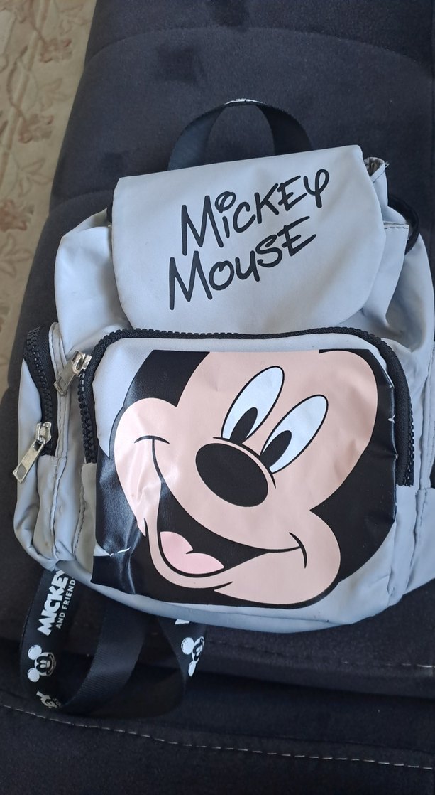 Gri renkte, ön cephesinde büyük Mickey Mouse yüzü ve kapağında ismi bulunan çocuk okul çantası. Çoklu fermuarlı bölmeleri vardır.