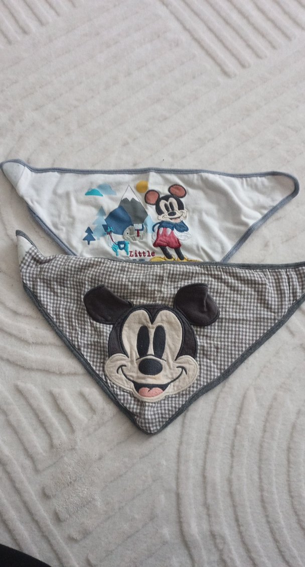 İki adet gri bebek önlüğü, biri büyük Mickey yüzü desenli kareli, diğeri küçük Mickey ve dağ desenli. Yumuşak kumaş, kenarları şeritli.