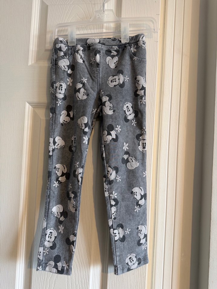 Gri denim kumaştan, düğme detaylı, Mickey Mouse desenli, bol kesim kız taytı. Rahat ve sokak stiline uygun. 4-5 yaş.