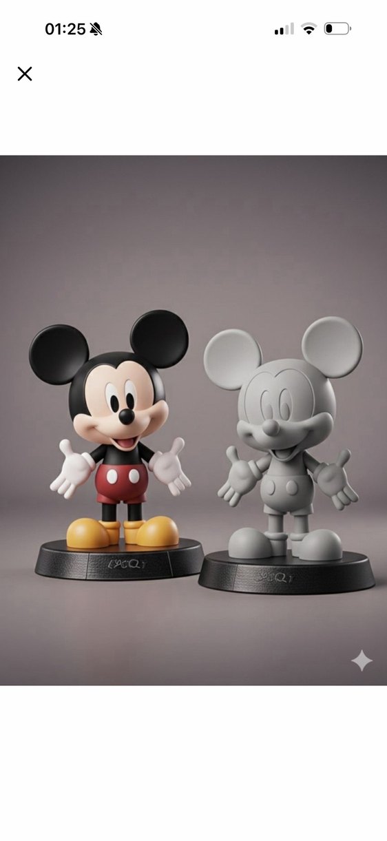 Renkli ve gri olmak üzere iki Mickey Mouse figürü, siyah taban üzerinde duruyor.