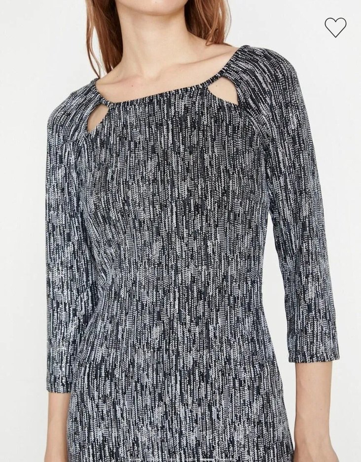 Gri renkli, bağlamalı detaylı tekne yaka ve pileli bağlama desenli, üç çeyrek kollu, midi boy simli elbise .hiç kullanılmadı .
