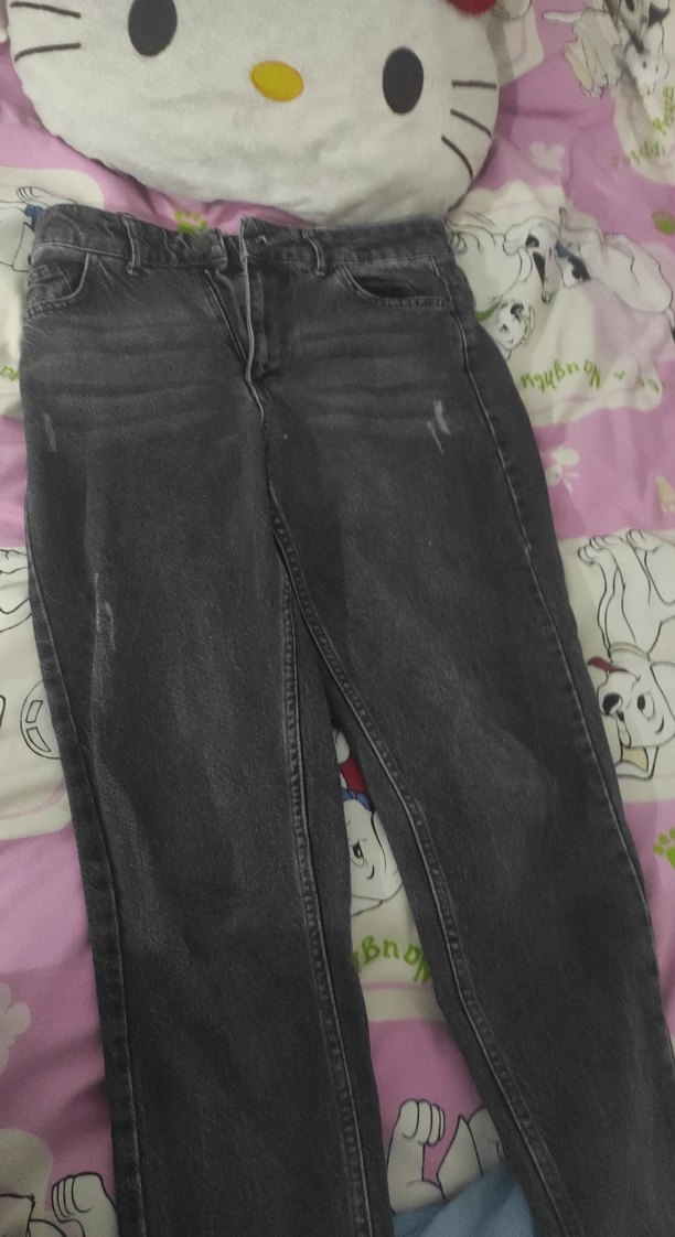Gri renkli denim kot pantolon, bol kesim ve midi boyda. Tokalı detaylarıyla sokak stiline uygun, günlük kullanıma ideal.