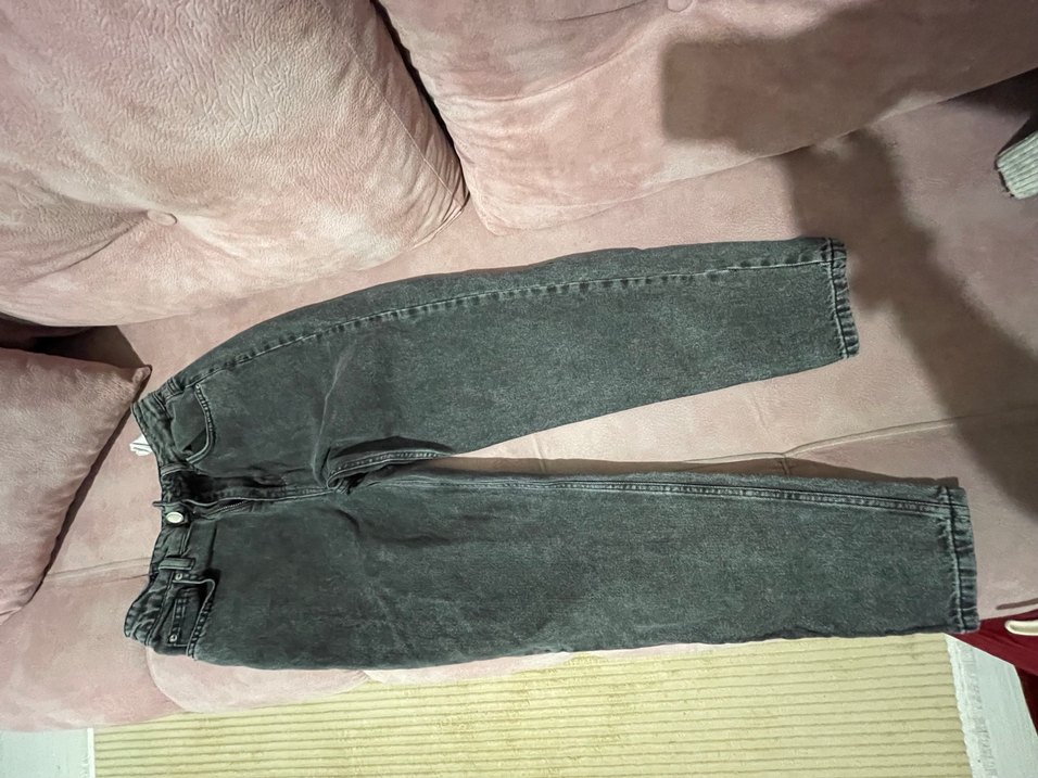 Bol kesim, kemerli gri denim kot pantolon, midi boy ve gündelik sokak tarzına uygun. Günlük kullanım için ideal. Esnek değildir . Çok iyi durumda .