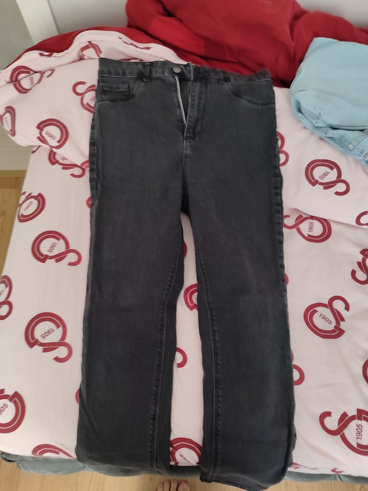 Gri renkte, dar kesim ve midi boyda kot pantolon. Tokalı detayıyla günlük rahat ve sokak stiline uygun bir model.