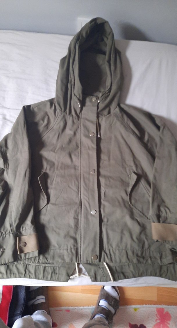 Geniş kesim, düğmeli ve kapüşonlu gri midi boy kadın ceket. Uzun kollu, keten kumaştan, rahat ve dış mekan kullanımı için uygun.
