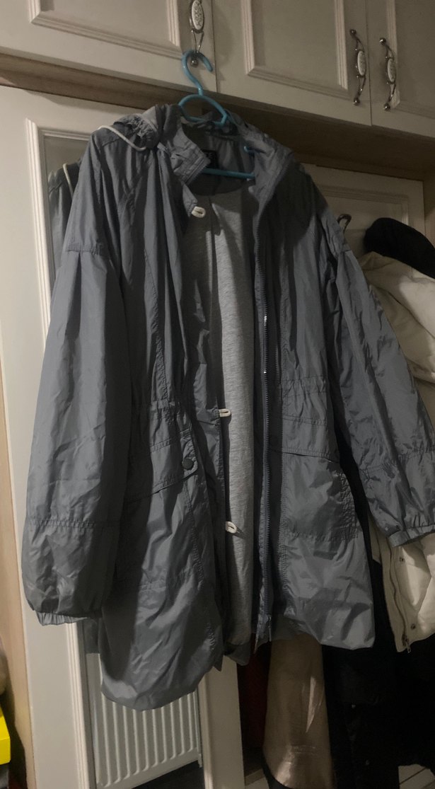 Gri renk, midi boy, düğmeli kadın yağmurluk Notlu yaka ve uzun kollu, rahat kesim. günlük kullanıma uygun. ️