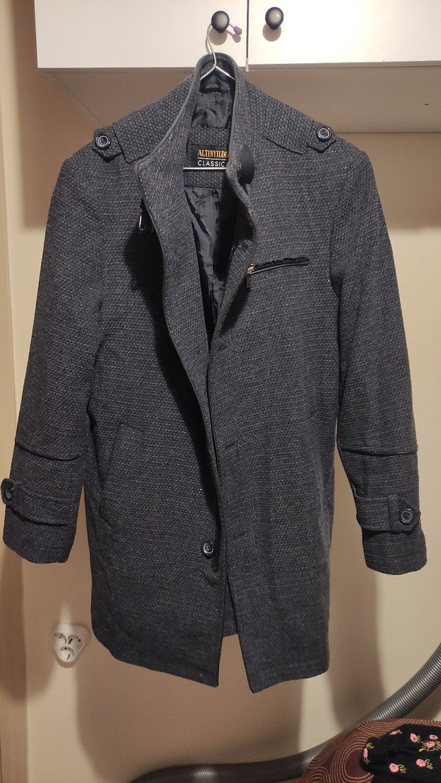 Gri renkte, düğmeli ve kesimli yaka detaylı erkek ceket. Uzun kollu, midi boy . Günlük kullanıma uygundur.