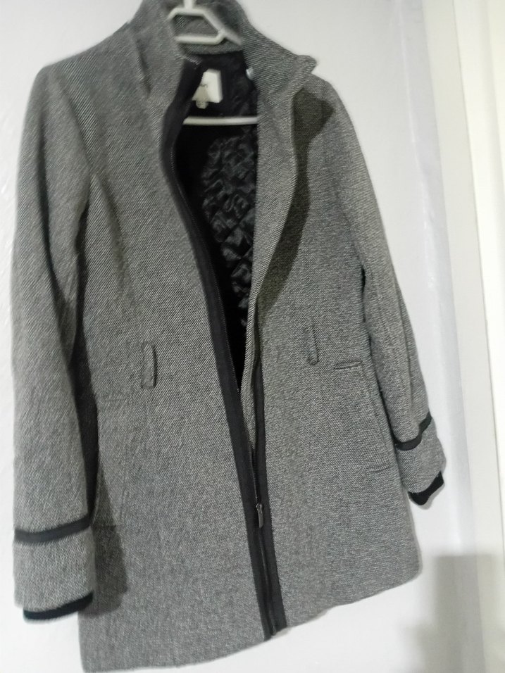 Gri midi boy, fermuarlı hamile kabanı, uzun kollu ve rahat kesim. Yumuşak ve sıcak kumaştan, günlük kullanıma uygun.ikikoltuk arası 50. santim boyu 87 santim