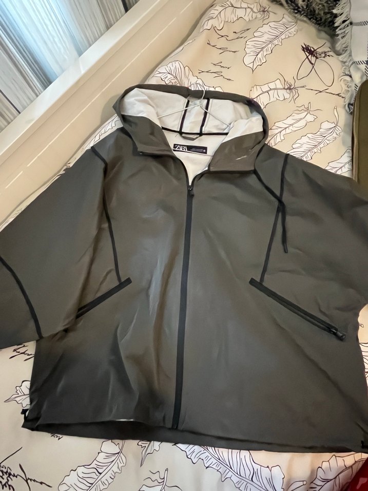 Gri renkte, sentetik kumaştan, kapüşonlu, uzun kollu ve yüksek yakalı erkek yağmurluğu. Fermuarlı ön ve cepleriyle dış mekanlar için uygun. Yağmurluk yeni hiç giyilmedi kokusu bile yeni