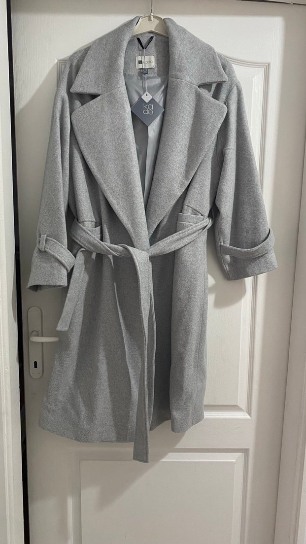 Gri midi boy, bel kemerli kaban, notched lapel yaka ve uzun kolludur. Yumuşak ve sıcak kumaştan üretilmiş, desen içermeyen rahat bir normcore tarzı sunar. Hiç giyilmedi.Etiketi üzerinde.