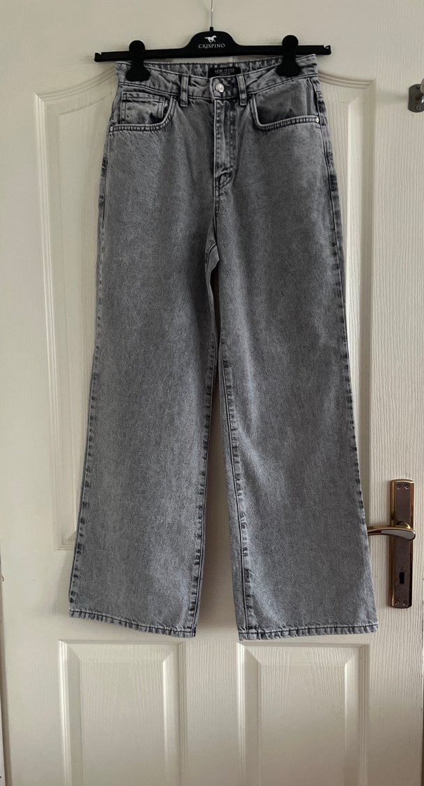 Gri kot pantolon, rahat kesim ve midi boy uzunluğuyla günlük kullanıma uygun sade ve şık bir görünüme sahiptir. Desensiz tasarımı normcore stilini yansıtır.