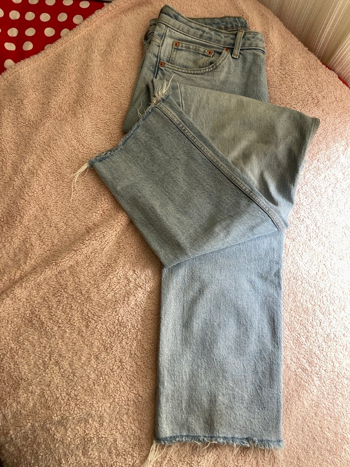 Denim kumaştan yapılmış, gri midi boy rahat kesim kadın kot pantolon. Fermuarlı detay ve desensiz sade tasarıma sahiptir, günlük kullanım için uygundur. üzerinde çok minik mavi bir leke var hiç çıkarmı diye denemedim