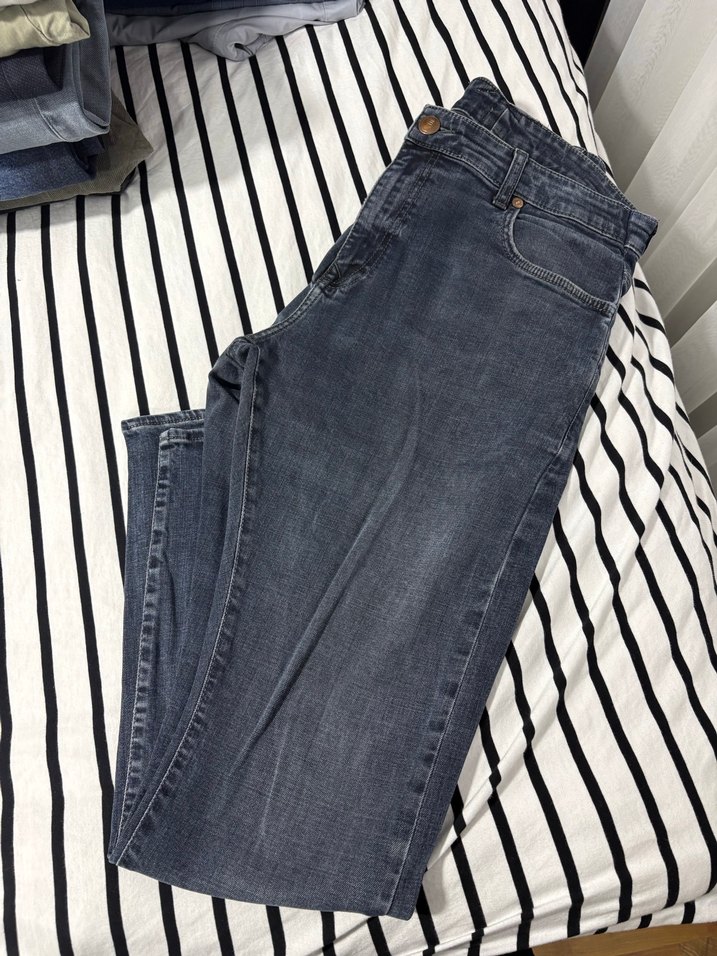 Gri renkte, midi boy, regular fit kadın kot pantolon. Denim kumaştan, pilili detaylı ve günlük sokak stili için uygundur.