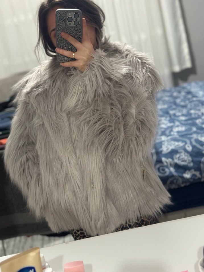 Gri midi boy, uzun kollu, yüksek yakalı suni kürk kaban. Rahat kesim ve kürk detaylarıyla bohem sokak stili için uygun. Ayy kızlar inanılmaz tüylü ama çok güzel kombinler çıkar alın hayrını görün
