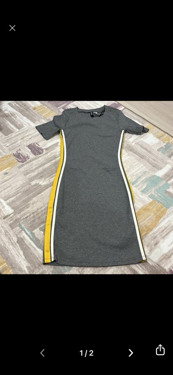 Kemerli, kısa kollu, gri midi elbise, bisiklet yaka ve yanlarda çizgili detaylarla trend görünüm sunar. Günlük kullanıma uygundur.