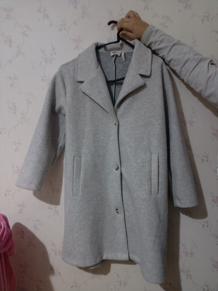 Gri renkli, düğmeli ve normal kesim midi uzunluğunda kadın kabanı. Yumuşak ve sıcak kumaştan, uzun kollu ve deseniz tasarıma sahip, günlük kullanıma uygun.