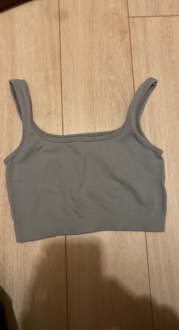 Gri renkli, kolsuz ve tek renk midi crop top. Tekstil yumuşak ve sentetik malzemeden, spor ve sokak giyim tarzına uygun.