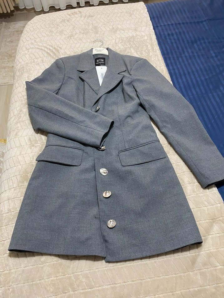 Gri midi uzunlukta denim kumaştan yapılmış, düğmeli ve keskin yakalı kadın ceket. Uzun kollu ve regular fit, iş ve sokak stiline uygun.