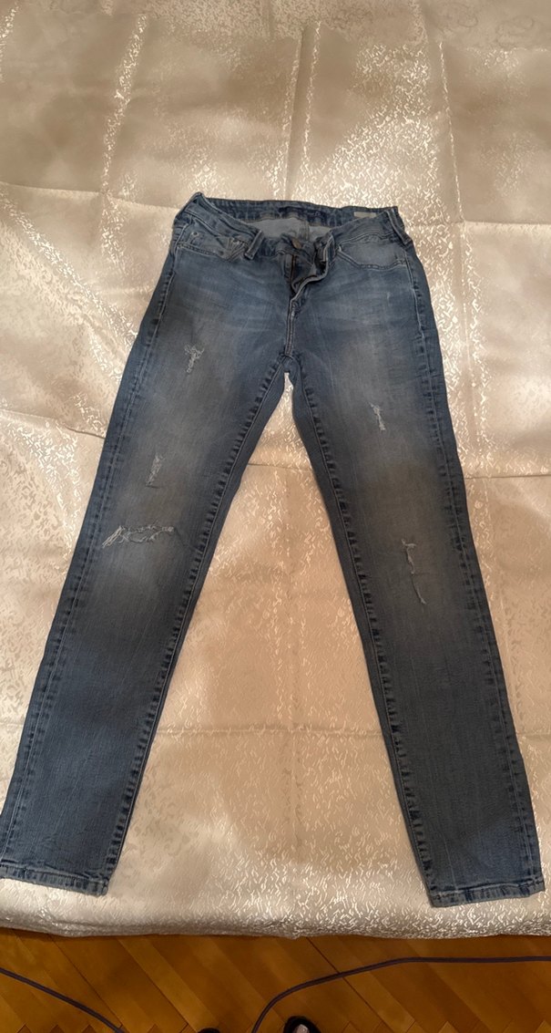 Gri tonlarında, midi boy, regular fit denim kadın pantolon. Yırtmaç detayları ve sade tasarımıyla günlük kullanıma uygun.