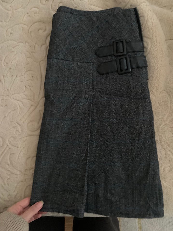 Gri kot kumaştan, kemerli ve diz boyu kesime sahip dar kesim kadın eteği. Ofis ve günlük sokak stiline uygundur.