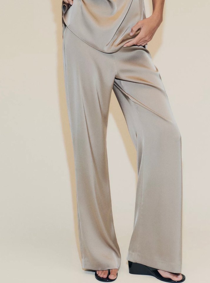 Saten kumaştan, dökümlü tasarıma sahip gri midi pantolon. çağdaş stil, regular fit.star parça. Takım. Kombını cok şık