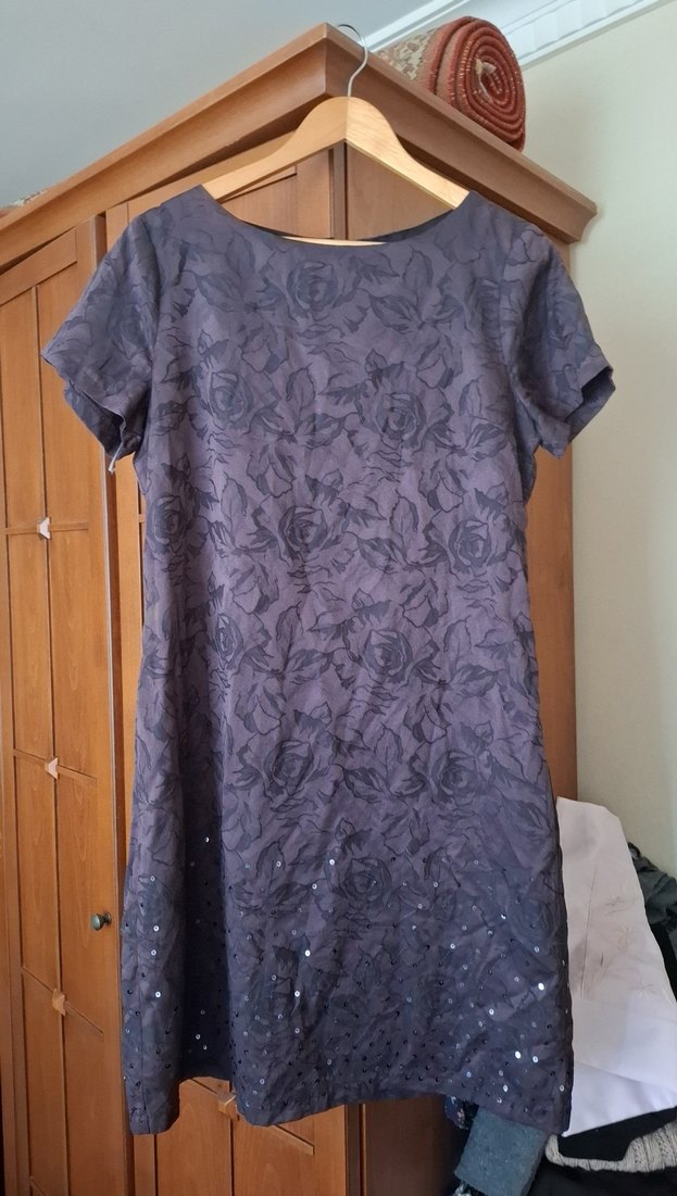 Kısa kollu, gri baskılı midi uzunlukta, drapeli ve bol kesim kadın elbisesi. Yuvarlak yakalı, vintage goth tarzıyla romantik akşamlar için uygun.