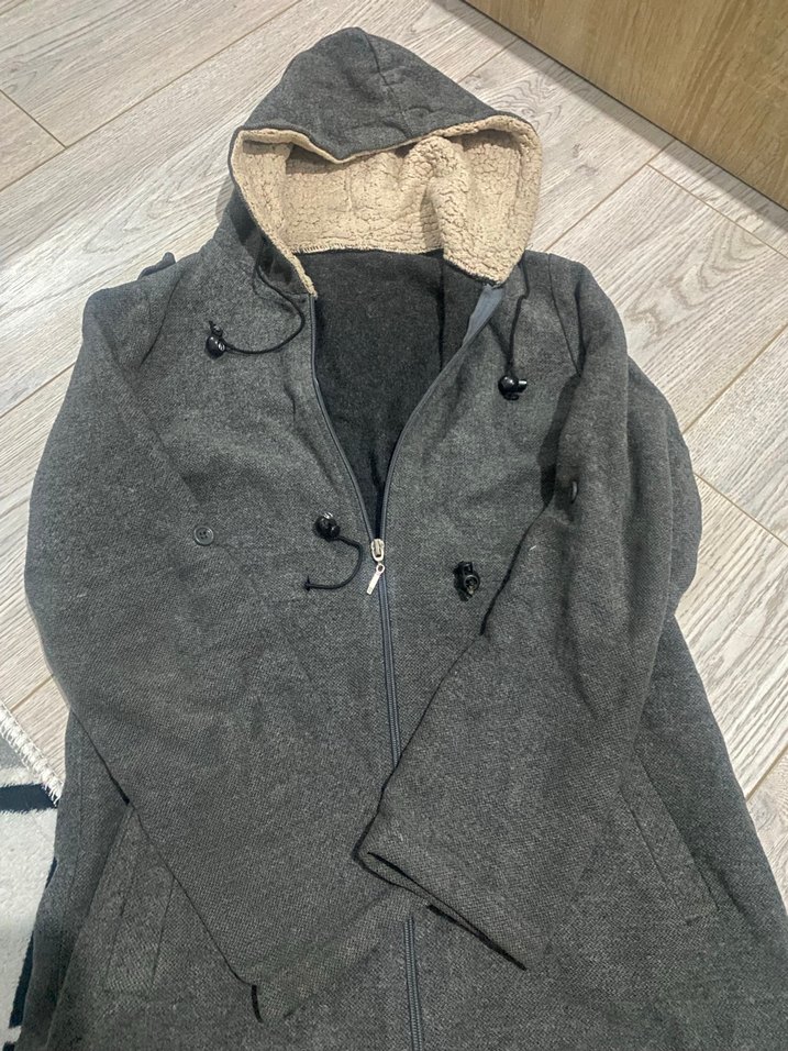 Gri midi uzunlukta, düğmeli hamile kabanı. Notlu yaka ve uzun kollu, rahat kesimdir. İçinde yumuşak ve sıcak kumaştan fleece astar bulunur.