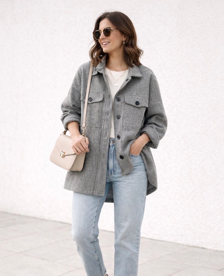Gri renkli, düğmeli, uzun kollu, normal boyda, notched lapel yakalı bol kesim ceket. Günlük kullanıma uygun.