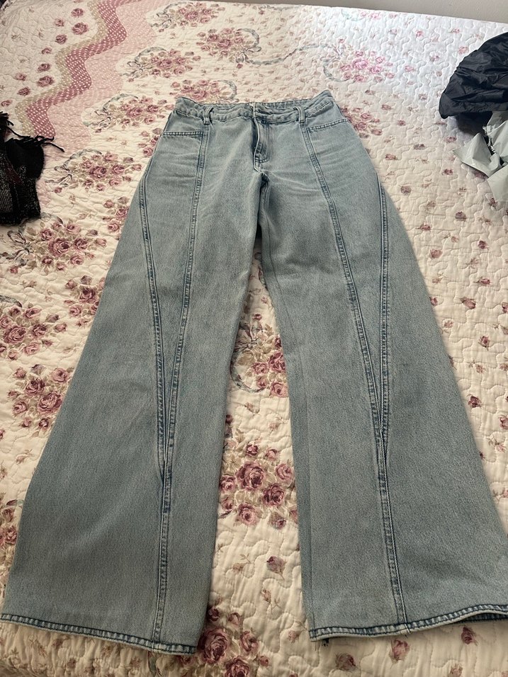 Gri midi uzunlukta, bol kesim kot pantolon.Desensiz ve vintage esintili normcore tarzda, günlük kullanıma uygun. Sorunsuz bel 38 boy 107 cm