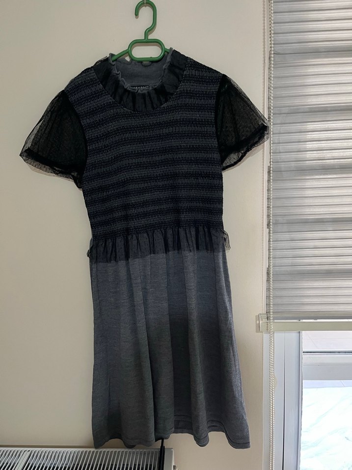 Gri renkte, yüksek yakalı ve kısa tüllü kollu, pilili detaya sahip, vücuda oturan midi uzunlukta gotik elbise. ✨