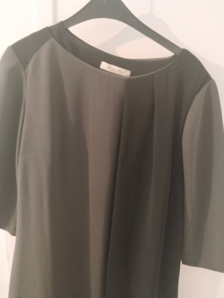 Gri renkli, yuvarlak yakalı ve yarım kollu füme ve siyah astarı var kemeri var kendi kumaşından çok temiz tabu marka Salaş kesim ve drapeli detaylarla, ipeksi dokuda, modern ofis stiline uygun.