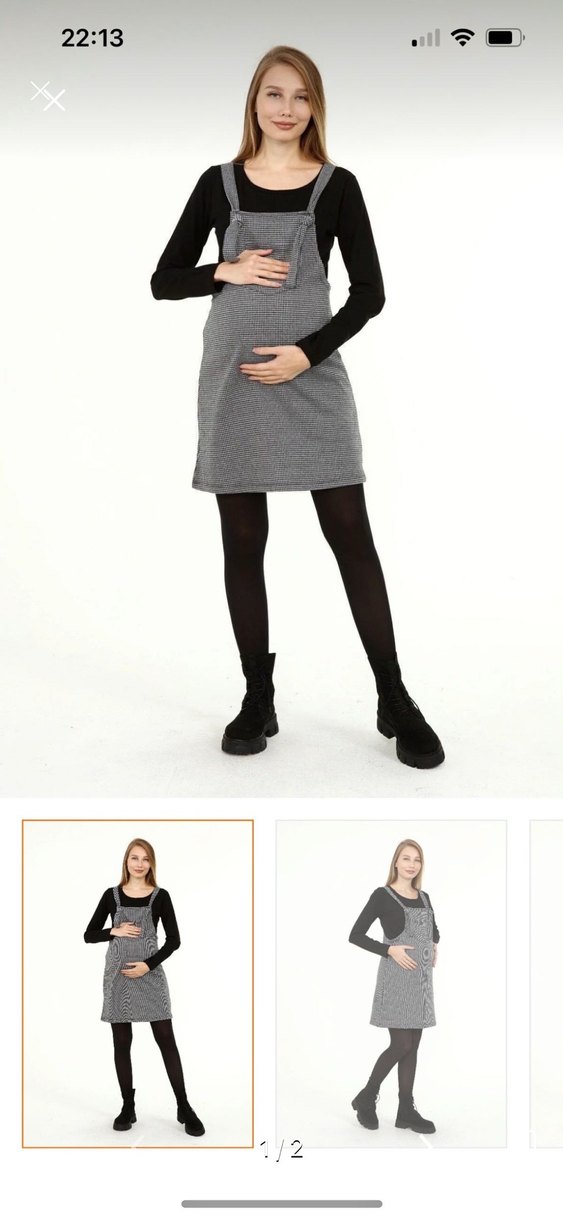 Gri midi hamile elbisesi, yüksek yakalı ve askılıdır. Yumuşak sentetik kumaştan üretilmiş, günlük kullanım için rahat ve şık bir seçenektir.